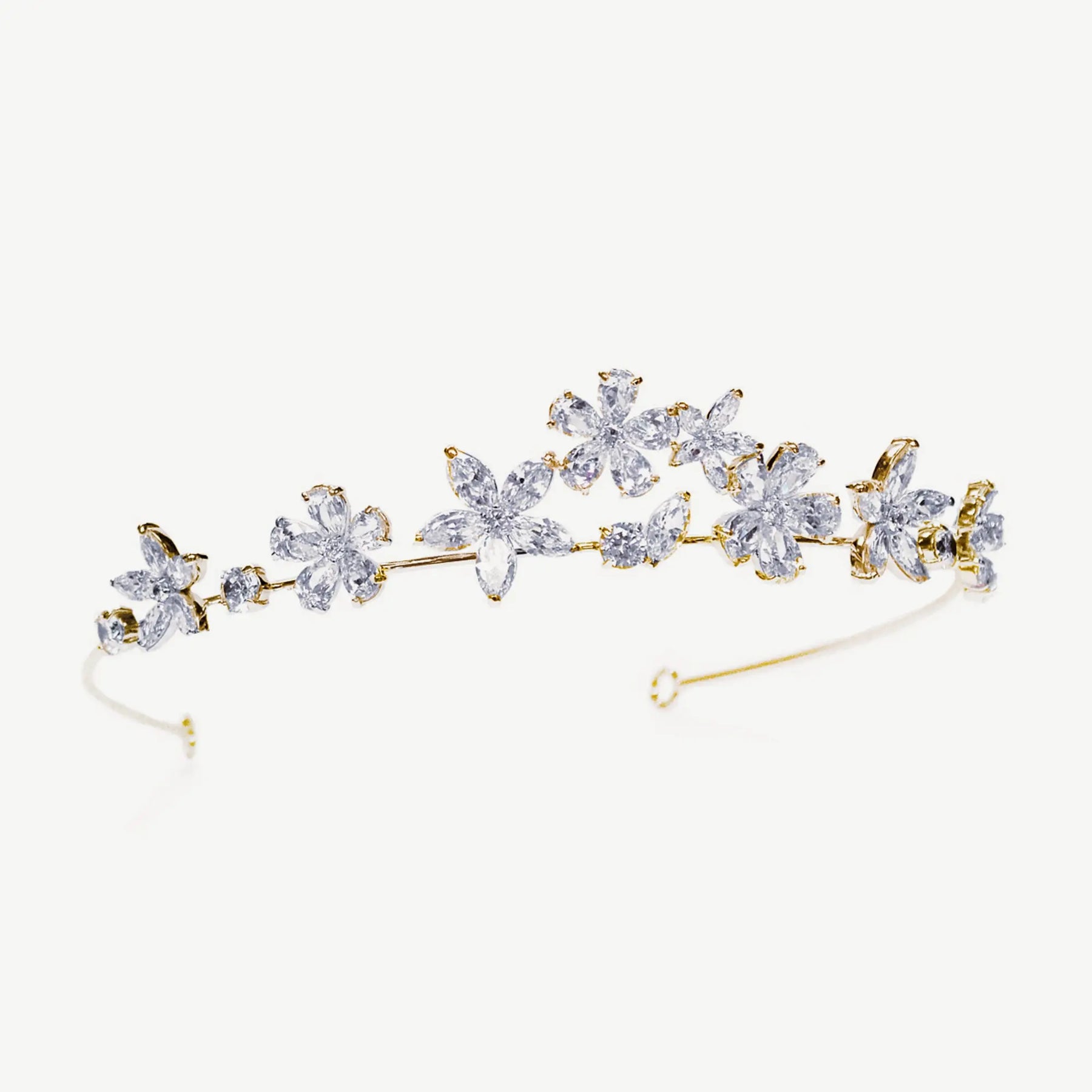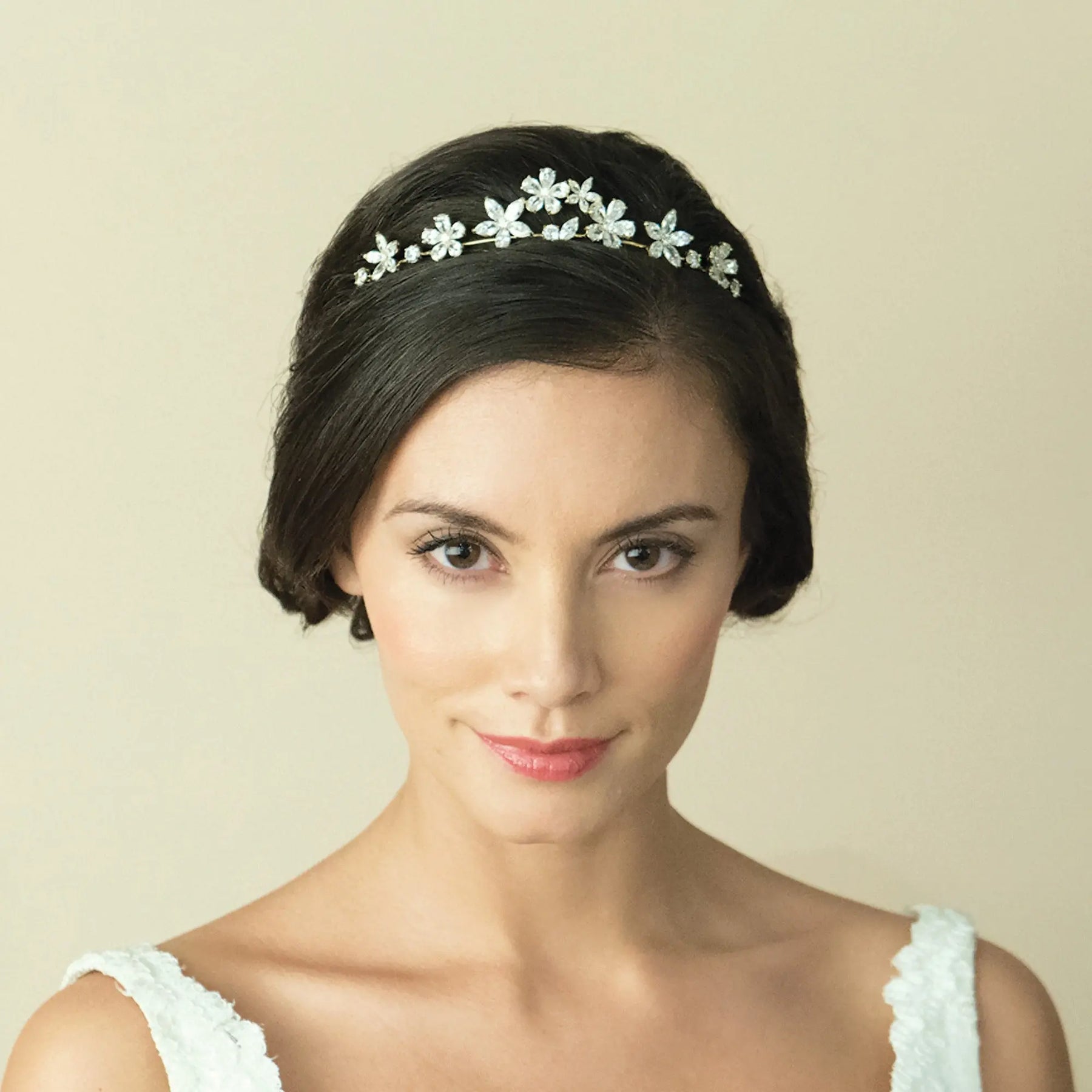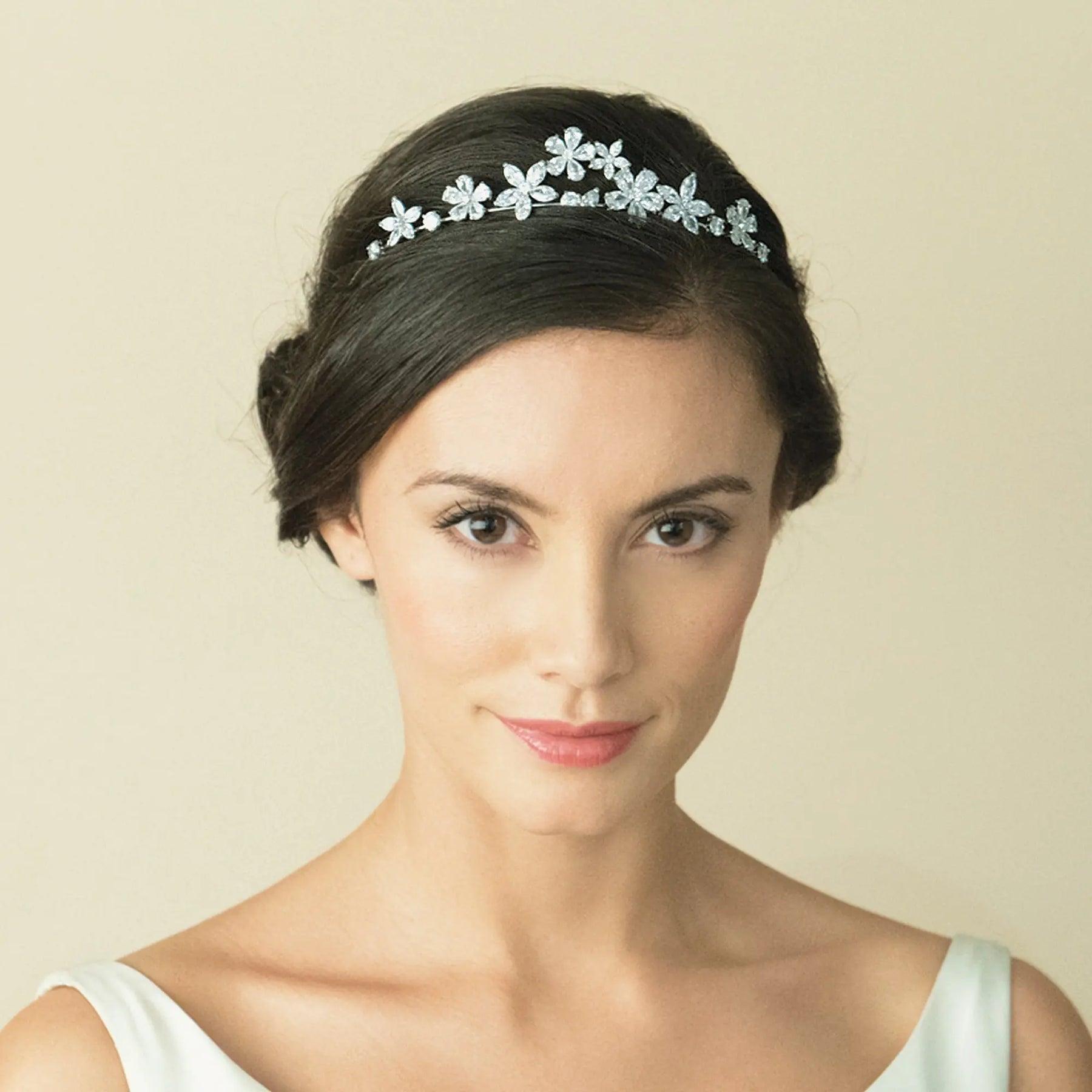 Son design associe des cristaux marquise, solitaire et goutte pour dessiner de petites fleurs scintillantes, comme si chaque pétale avait été délicatement déposé dans la coiffure.