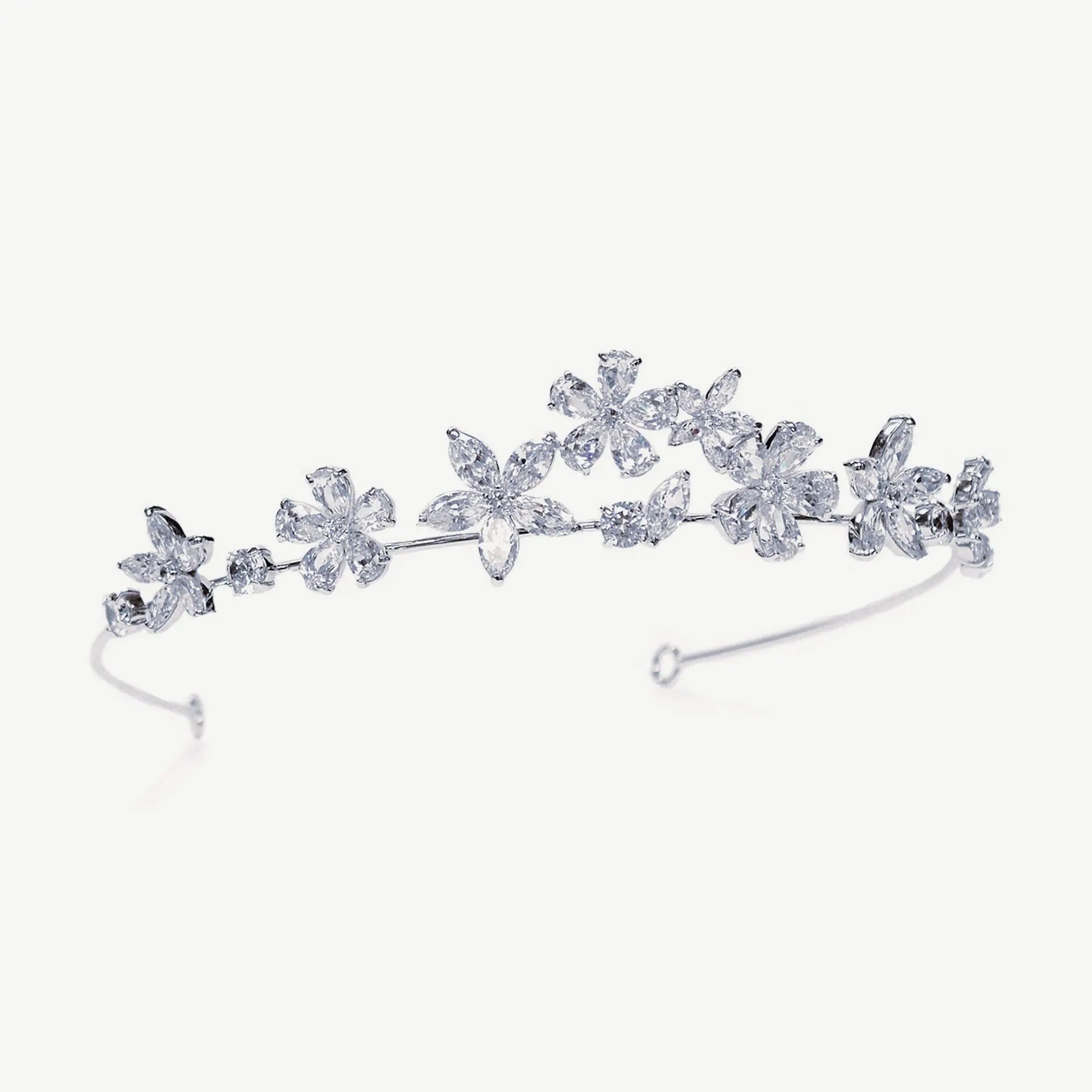 L’un des atouts majeurs d’Orange Blossom réside dans son illusion visuelle : une fois portée, elle ne ressemble pas à un bandeau ou une tiare classique, mais à une succession de petites fleurs cristallines comme fixées individuellement dans la chevelure.
