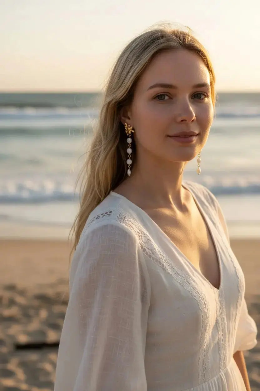 Les pendantes d’oreilles LOANA ont été imaginées pour sublimer la mariée avec naturel, finesse et légèreté. Composées de petits palets et de gouttes en nacre naturelle, elles captent la lumière avec délicatesse et apportent une touche d’éclat tout en douceur à la tenue de mariage.
