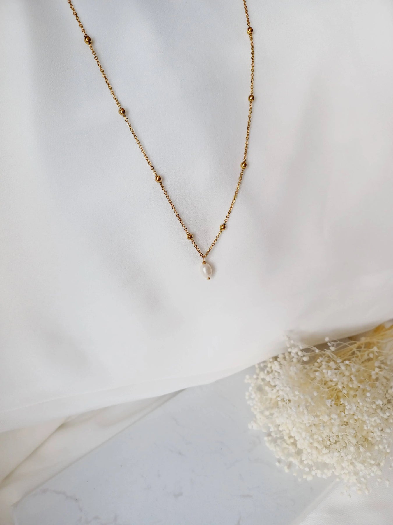 •Particularités: chaîne satellite avec billes, perles naturelles et fleur en porcelaine