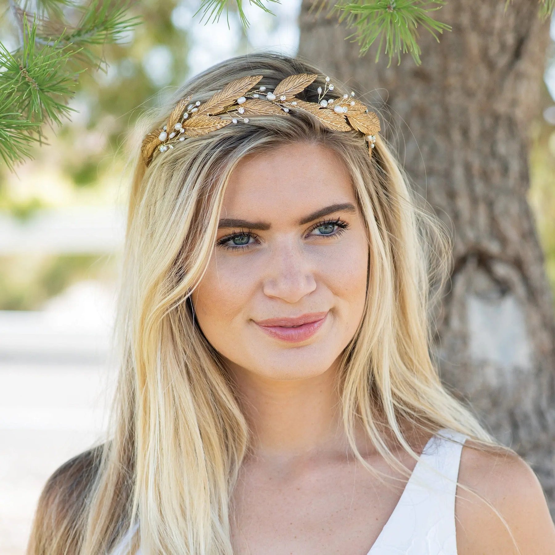 DIADÈME GRECIAN DREAM – FEUILLAGE BRONZE, PERLES D’EAU DOUCE ET CRISTAUX Ivory and co