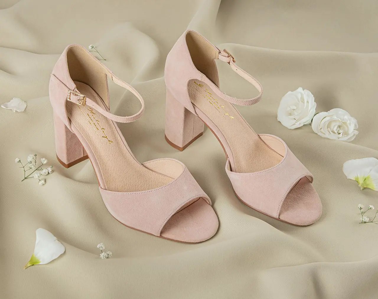 CHAUSSURES DE MARIÉE AMELIA – DAIM ROSE POUDRÉ À TALON BLOC CONFORTABLE