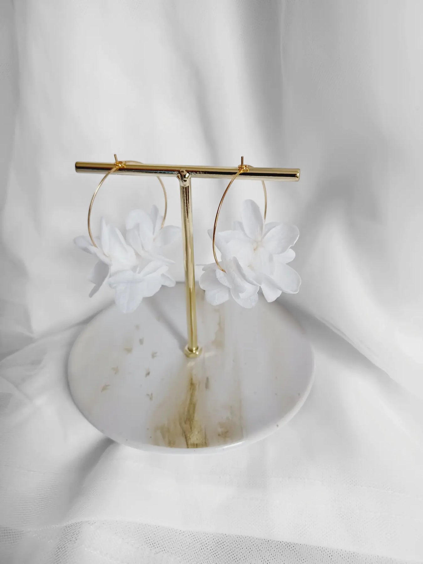 Réalisées à partir d’anneaux en acier doré, ces créoles offrent une belle tenue dans le temps tout en conservant un rendu fin et élégant. Les fleurs d’hortensias stabilisées, soigneusement sélectionnées, sont mises en valeur par leur teinte blanche douce et lumineuse. Elles apportent du relief et de la poésie au bijou, sans jamais être trop présentes.