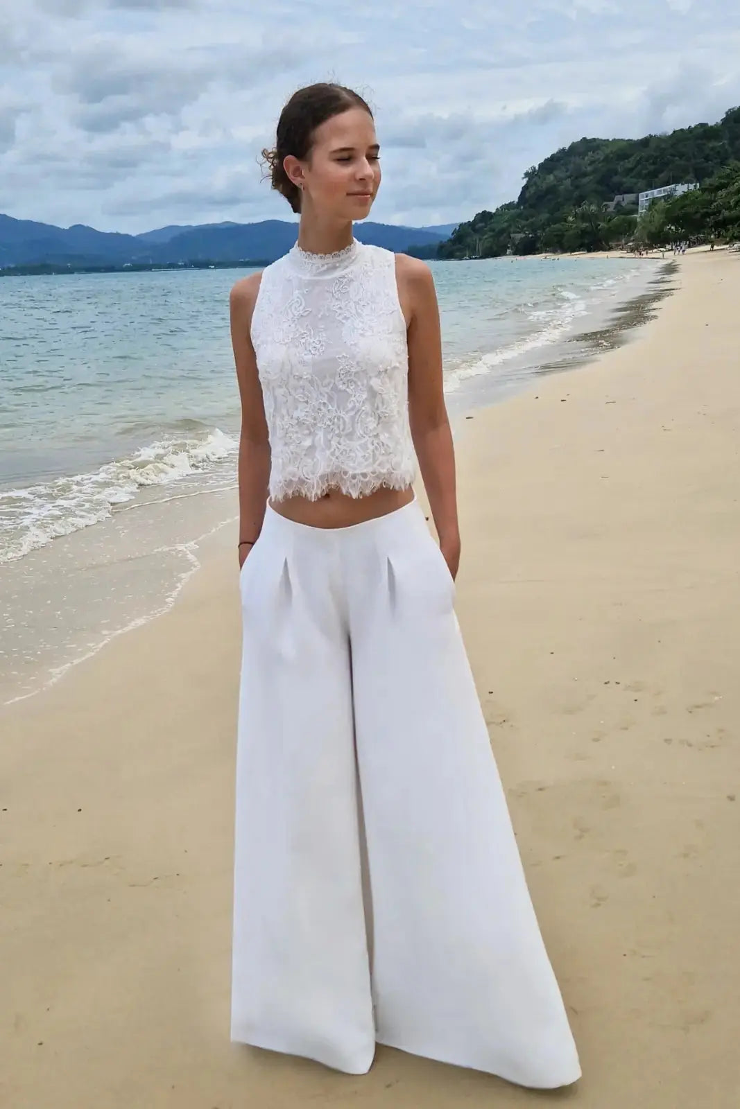 Idéal pour un mariage civil, un mariage en bord de mer ou une tenue de réception moderne, ce pantalon large de mariée permet de composer une silhouette audacieuse et raffinée.
