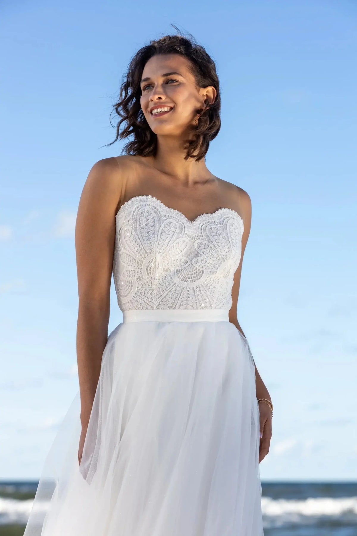 Son décolleté cœur met en valeur la poitrine et souligne délicatement le buste, offrant une allure féminine et harmonieuse. Cette coupe flatteuse apporte douceur et sophistication, idéale pour compléter une robe bustier, une jupe fluide ou une tenue de mariage civil chic.