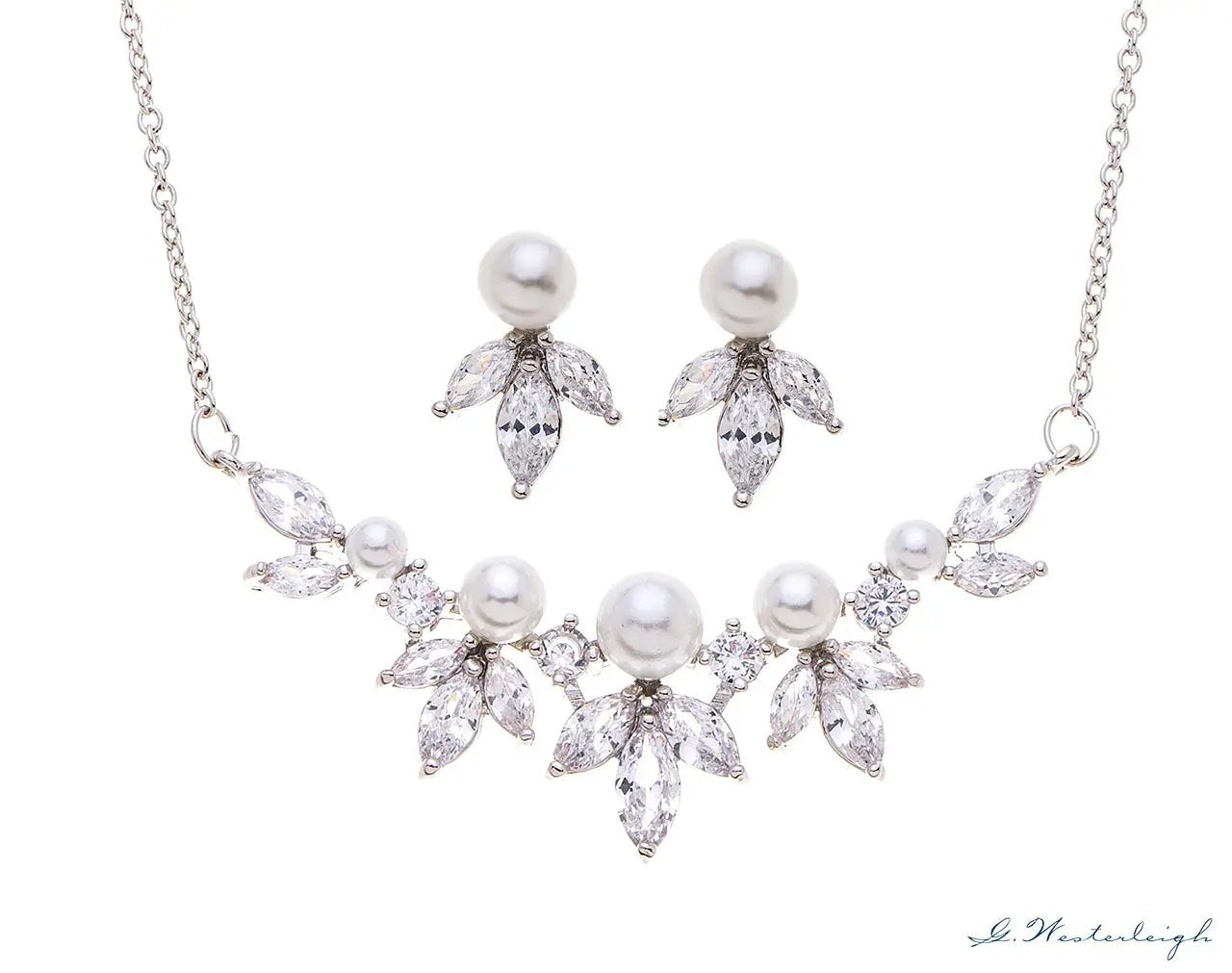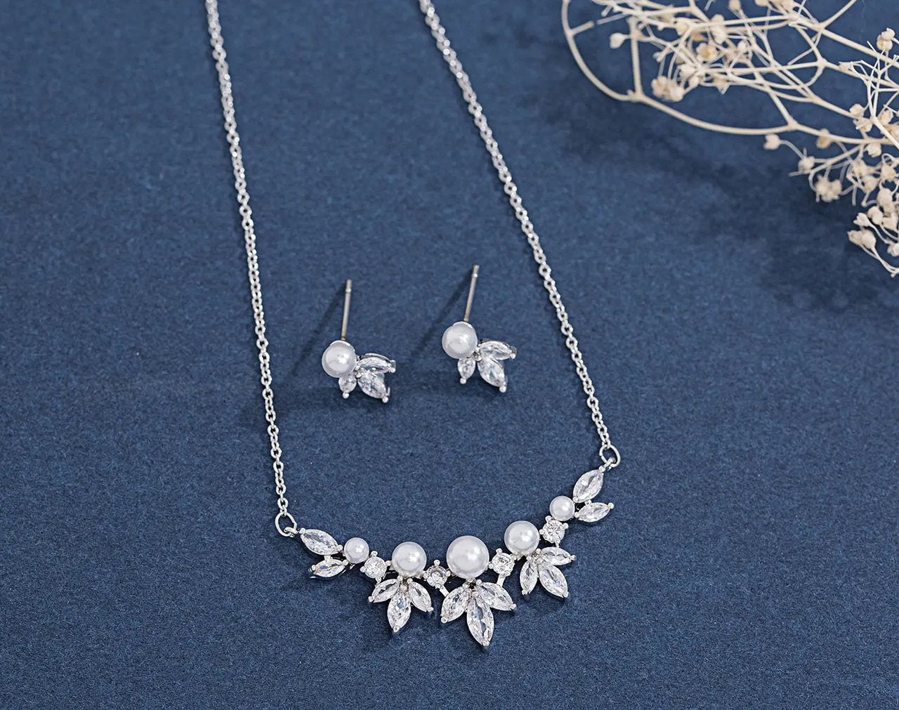 Ornée de cristaux de zircone cubique scintillants et de perles polies à la main, cette parure combine la pureté du blanc et la brillance de l’argent pour un rendu chic et harmonieux.