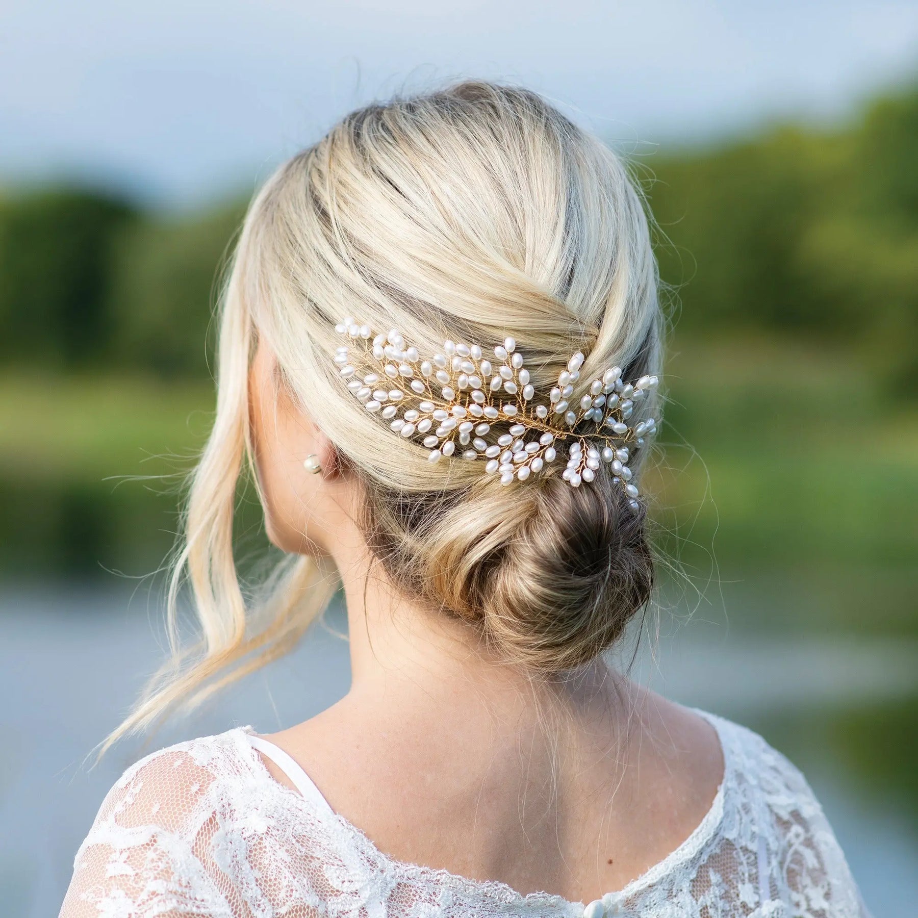Les perles nacrées, soigneusement disposées en grappes, apportent de la profondeur et du relief au bijou tout en conservant une grande légèreté visuelle. Leur teinte ivoire naturelle s’accorde parfaitement avec une robe de mariée, un voile ou une tenue plus fluide d’inspiration bohème.