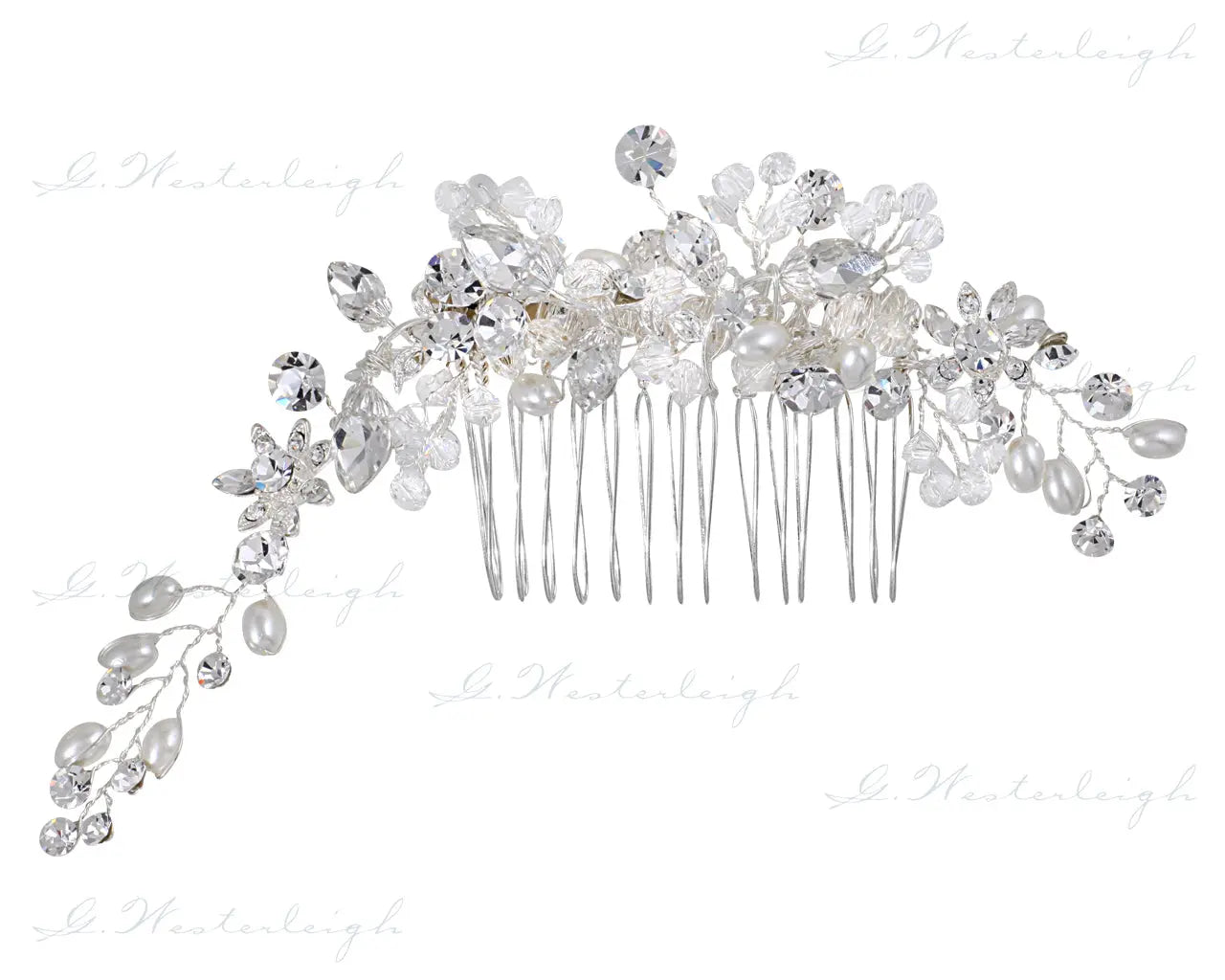 Chaque élément est assemblé à la main avec soin, créant un motif équilibré et aérien qui capte la lumière sans jamais surcharger la coiffure. Les strass apportent de l’éclat, tandis que les perles ivoire adoucissent l’ensemble et s’accordent parfaitement avec une robe de mariée, un voile ou une tenue de cérémonie.