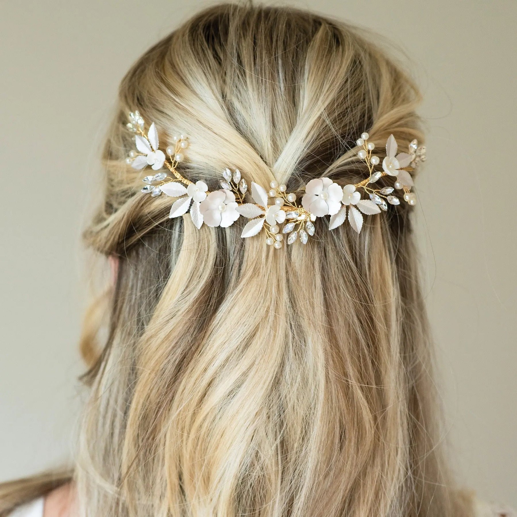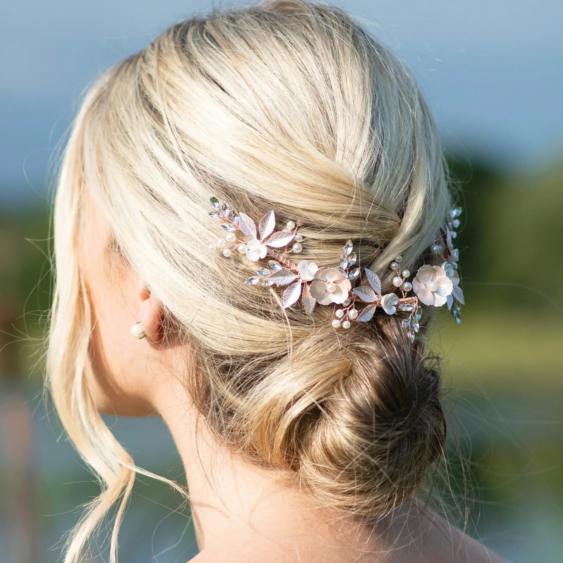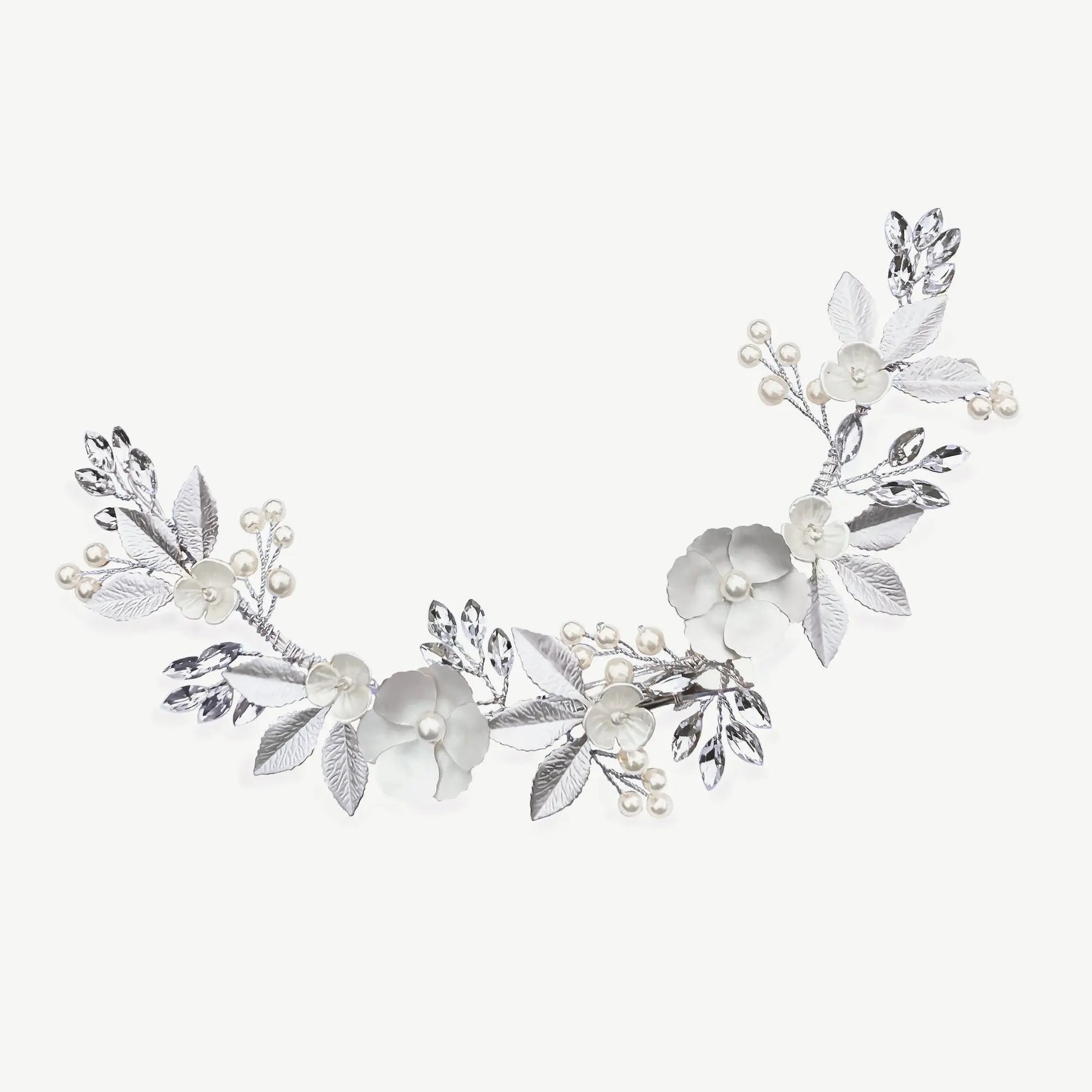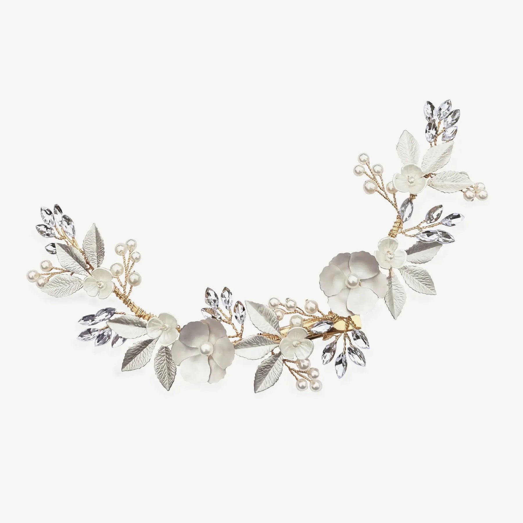 La pince à cheveux Éclat de Fleurs est une création aussi raffinée que spectaculaire, pensée pour illuminer la coiffure des mariées au style bohème et romantique. Inspirée par la nature, elle associe la brillance des cristaux autrichiens facettés à la délicatesse de fleurs et feuilles émaillées à la main, entrelacées de perles ivoire Natural Lustre.