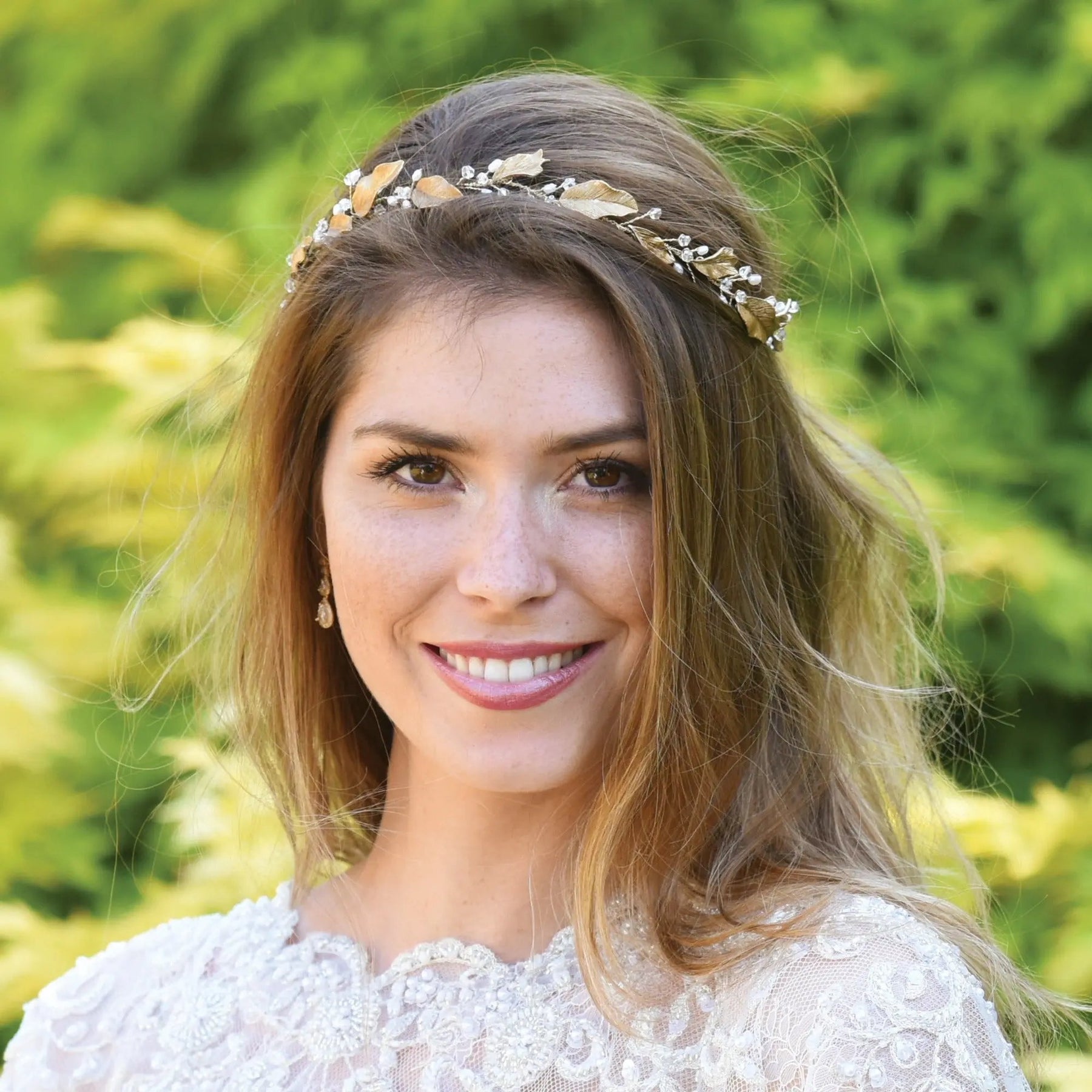 Chaque détail, du scintillement des cristaux à la teinte chaude du plaquage or 14 carats, est pensé pour sublimer les mariées en quête d’une touche naturelle et élégante.