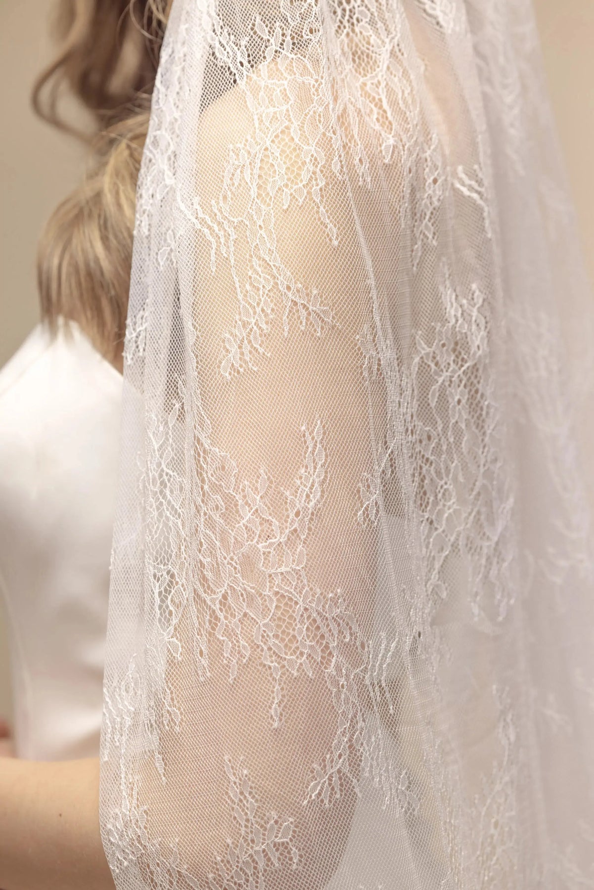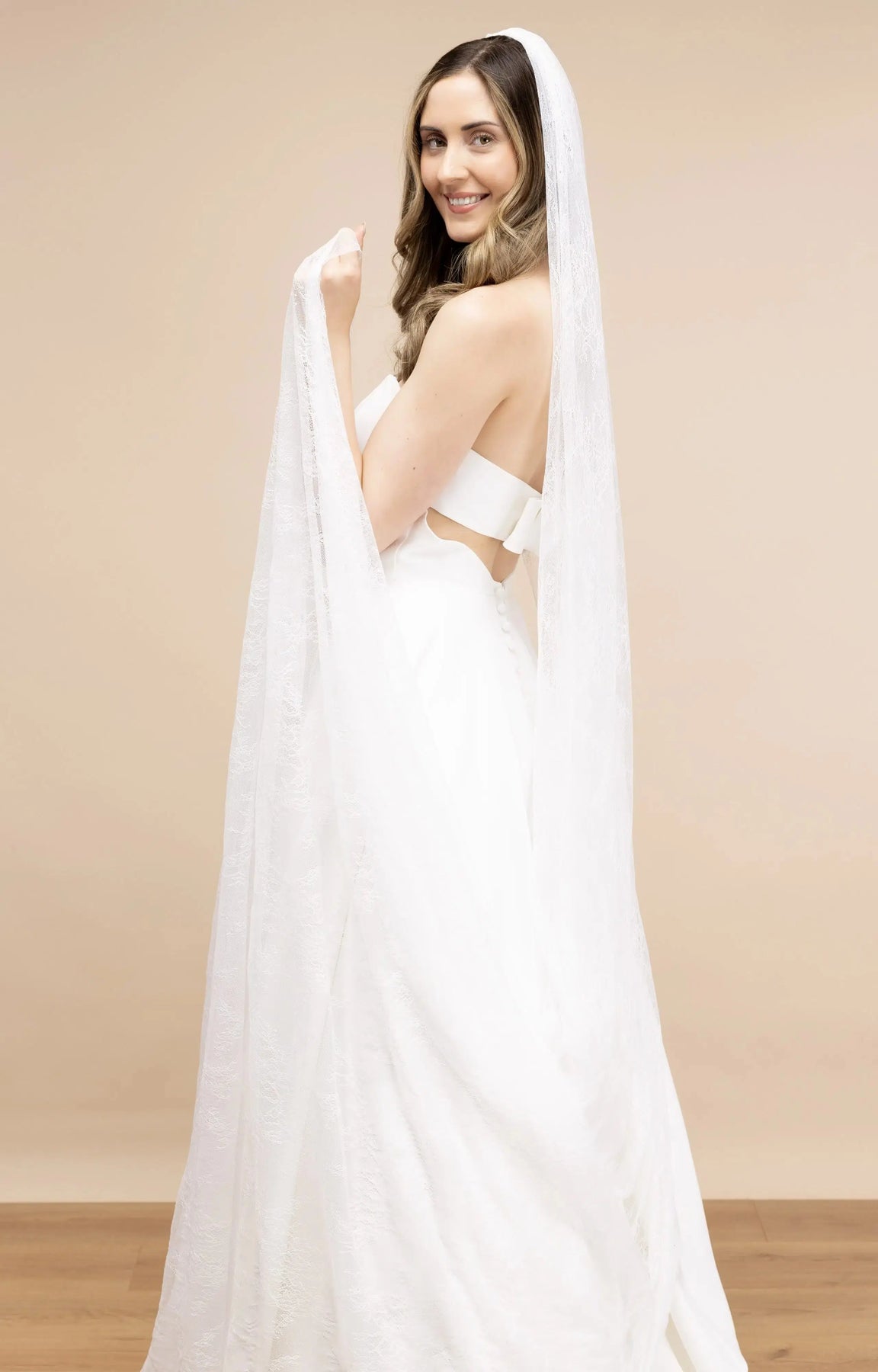Contrairement à un voile en tulle bordé, cette mantille est entièrement composée de dentelle, ce qui lui confère un rendu spectaculaire mais incroyablement doux. Elle encadre la silhouette avec grâce, créant un effet enveloppant et romantique, sans jamais alourdir la robe.
