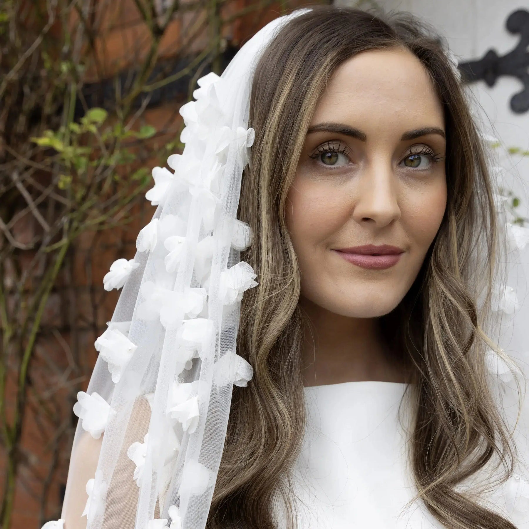 Sa particularité réside dans ses fleurs 3D en pétales de tulle ivoire, délicatement appliquées à la main. Elles sont disposées de façon plus dense sur la partie haute du voile, puis s’espacent progressivement vers le bas, offrant un effet de dégradé tout en légèreté. Ce jeu de volume et de transparence apporte du relief sans alourdir la tenue, pour un rendu à la fois moderne et très romantique.