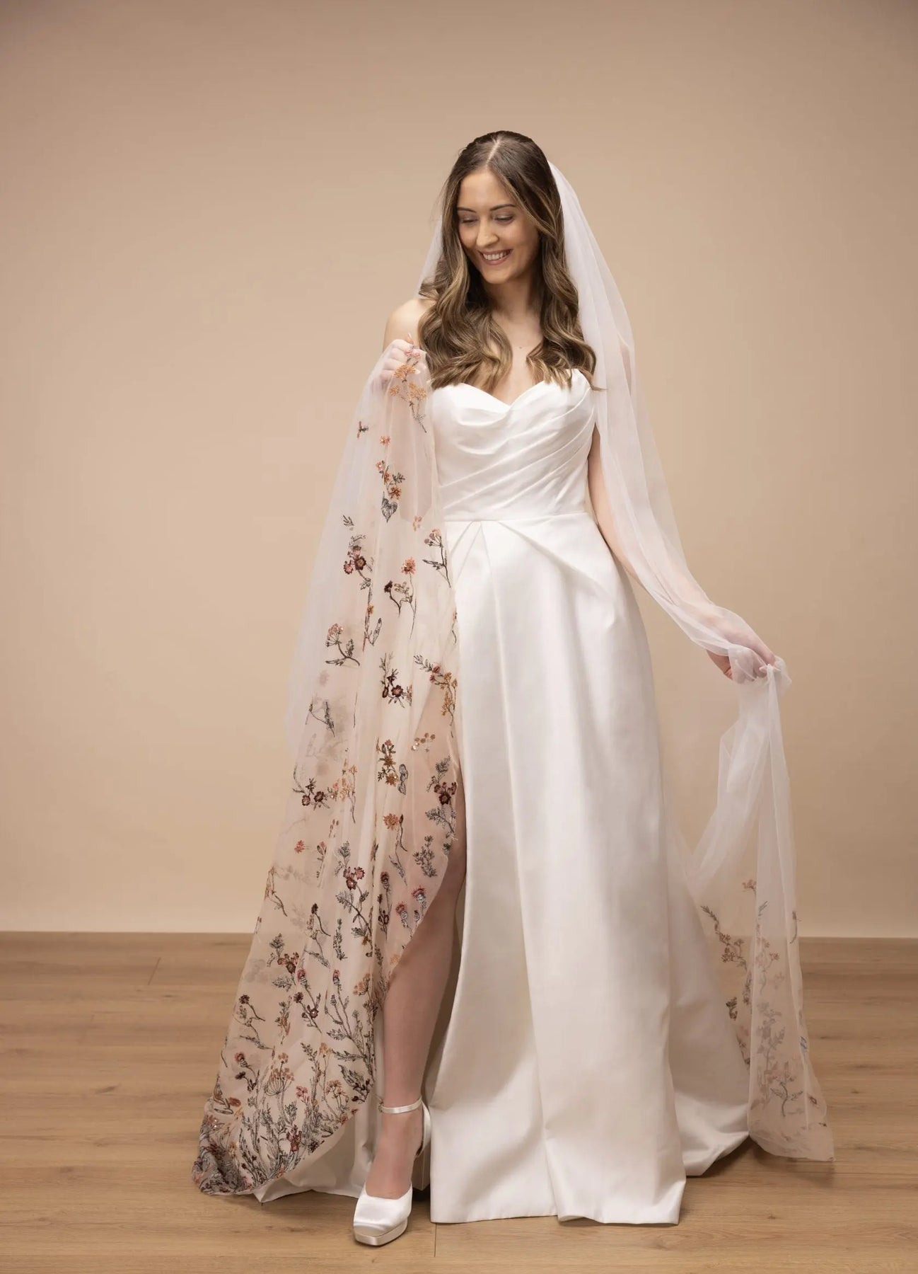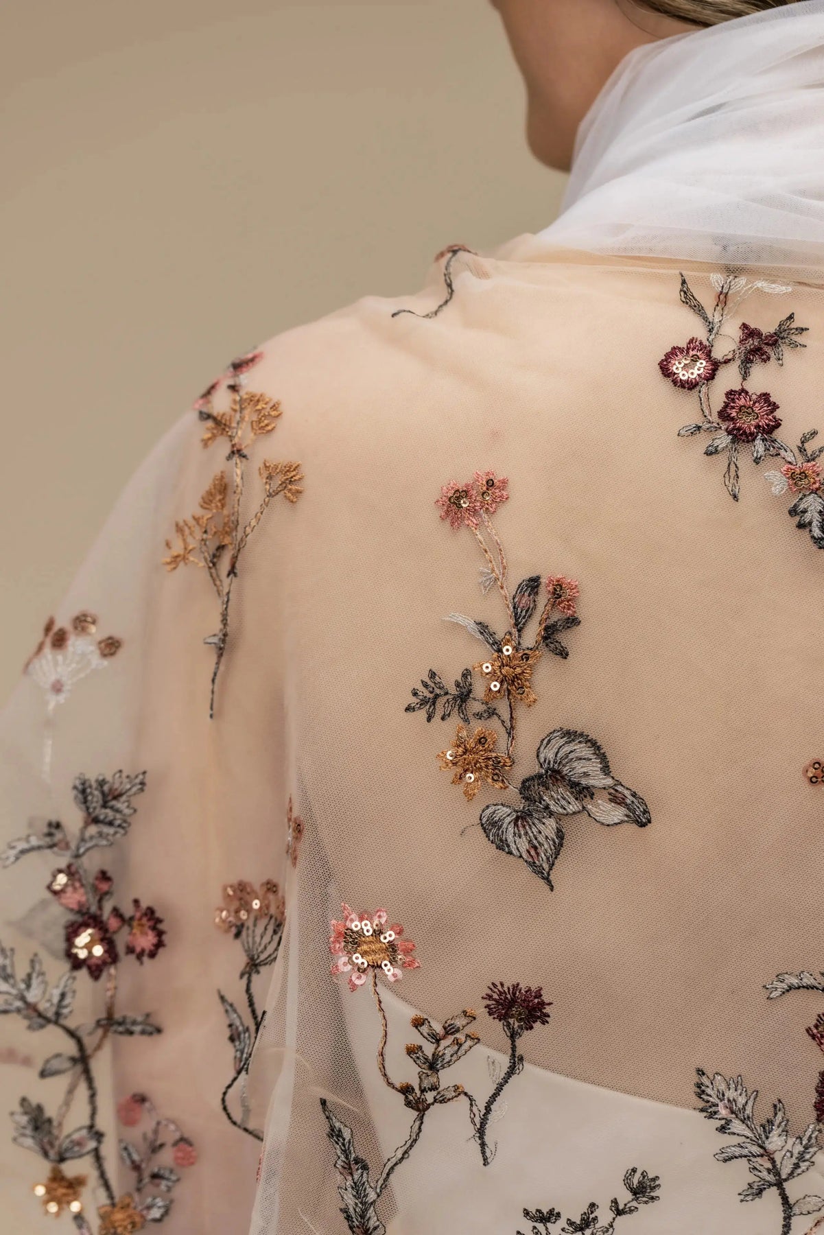 Réalisé en tulle fin et aérien, ce modèle se distingue par une somptueuse broderie florale placée sur toute la partie basse du voile. Les motifs délicatement brodés évoquent un jardin romantique, mêlant des nuances douces de vert, de bleu, d’orange et de rouge, pour un rendu à la fois naturel, artistique et très couture.