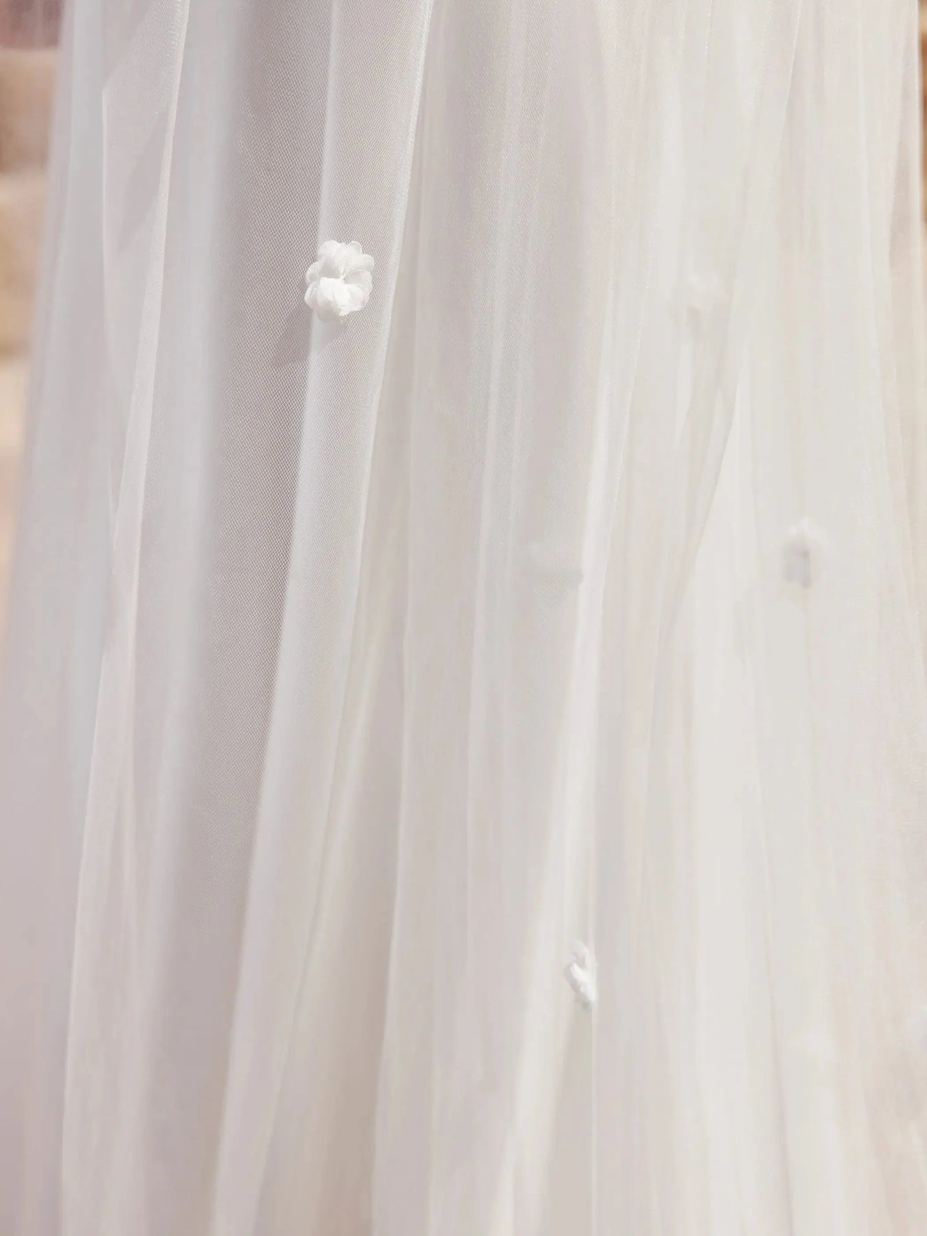À une seule couche pour un rendu naturel et léger, il se distingue par sa bordure coupée-nu, subtile et moderne, qui met en valeur sa simplicité. Ce voile est sublimé par de petites fleurs 3D appliquées avec délicatesse, créant un relief discret et poétique. Ces détails floraux apportent une touche romantique et raffinée, sans jamais alourdir la silhouette.